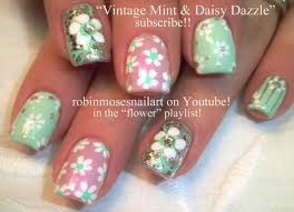 I have most of my nails done with the closest green I have to mint which is from Misslyn and my accent nail done in Royal Flush Blush by OPI. Having got my base down I then made the little white petals of the daisies. My nails were just cut down (they were getting really long but many of them had broken) so I didn`t have much space to work with. My daisies don`t really have the spaces for the middles that Robin`s does but they still look good. I used a green center for my accent nail and Revlon Top Speed 850 Metallic as the middle for my other nails. This is the shiniest sparkliest silver I have. I love it! Here are the pictures.